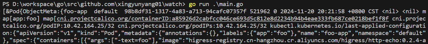 可以看到,在创建 Informer 时,可以使用 ForResource 方法进行创建。在设置监听事件时,你可以像之前的代码一样,传入具体的 Handler。但由于在这里,我用不到事件回调,我只是想用 Informer 的 List 功能,因此也可以像我一样传入 &cache.ResourceEventHandlerFuncs{} 这样一个空的 Handler。最后看一下效果: