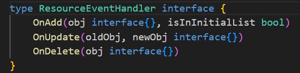 客户端在监听资源对象时,实际上监听的是增删改这三类事件。Informer 提供了添加自定义事件回调函数的功能,即 Handler。Handler 的类型如下图所示,是一个接口,包含了 Add、Update、Delete 三类方法,我们只需要实现下图所示的三个方法,便可以实现增删改三类事件的回调。
