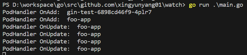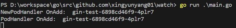 我们运行程序后,可以看到,在 Add 事件回调中,打印出该 pod 的名字。