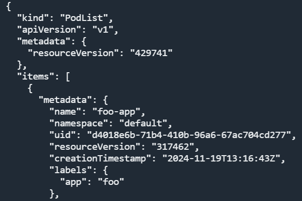 1 | curl -k -H "Authorization: Bearer $TOKEN" $APISERVER/api/v1/namespaces/default/pods |