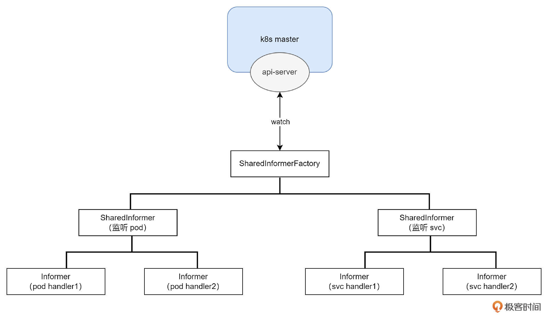 这种基础的 Informer 只能绑定一个 Handler。假设对于 pod 的监听事件,我们想创建两套 Handler,分别在回调中处理不同的业务,此时就只能创建两个 Informer 来分别绑定。这样相当于与 API Server 建立了两条链路,加大了资源开销。于是 client-go 中,又提供了 SharedInformer 的概念。