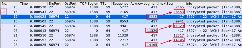 上图中,我们选中了17号报文,Wireshark自动找到了被它确认的16号报文,也在它的左边打上了一个小小的勾。当然,我们也可以通过对比NextSeq和ACK来找到这种关系。我在图中就用红框和箭头找到了这里的3对TCP确认关系。