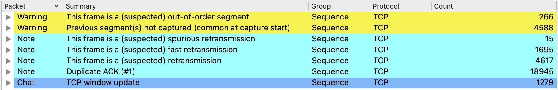 另外就是要查看TCP传输过程中的一些行为了,这些行为没办法在I/O Graph上体现出来,但是它们很可能就是“因”,正是因为它们,才有了传输速度这个“果”。