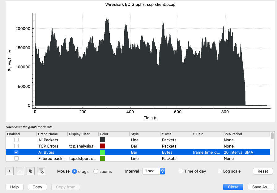 当然,在实际场景里,我们可以直接利用Wireshark的I/O Graph查看速度趋势图,这样最方便,并且有不同时段的速度,方便我们对整体状况做全面的评估。