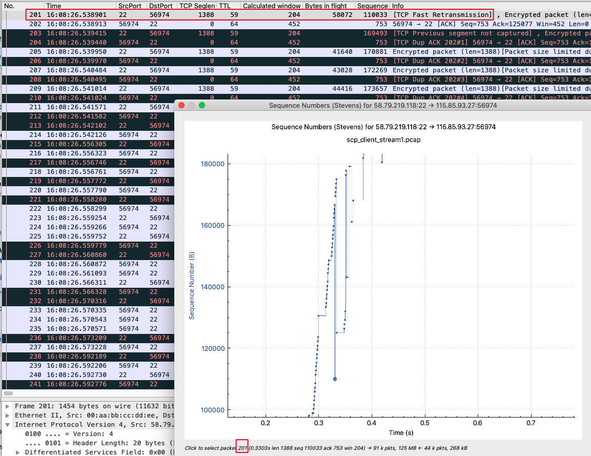 定位到这个点之后,发现它是201号报文。在主窗口里,我们可以看到,201号报文是一个TCP Fast Retransmission,也就是快速重传报文。那么通过这个重传,TCP拥塞控制机制就感知到了拥塞,然后进入了拥塞避免阶段。