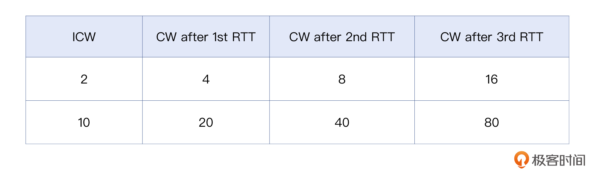 前面刚介绍过,在慢启动阶段,每过一个RTT,拥塞窗口就翻倍。那么不同的ICW就会造成不同的传输速度,比如: