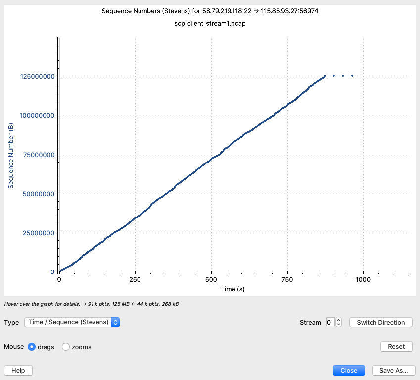 然后我们再看一下拥塞。在这个Graph中,也明显有几个点出现了异常。因为Y轴代表序列号,那么这些低处的点位,它们的序列号自然就是比前一个更低(也就是更小)的值,说明这些是老的报文再次发了出去,所以可以判断为是重传。