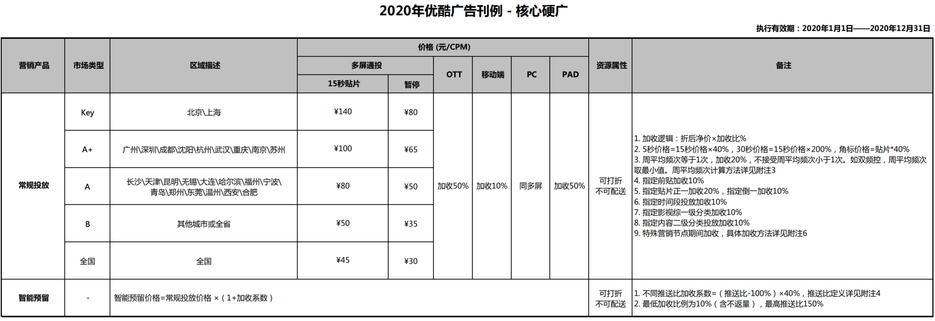 像微信的朋友圈广告、爱优腾的视频贴片广告,经常采用这种计价方式。我们以2020年优酷广告为例,全国范围内通投的15秒视频贴片广告的CPM刊例价格是45元,也就是广告主要购买一千次广告曝光,在未打折的前提下需要支付45元。