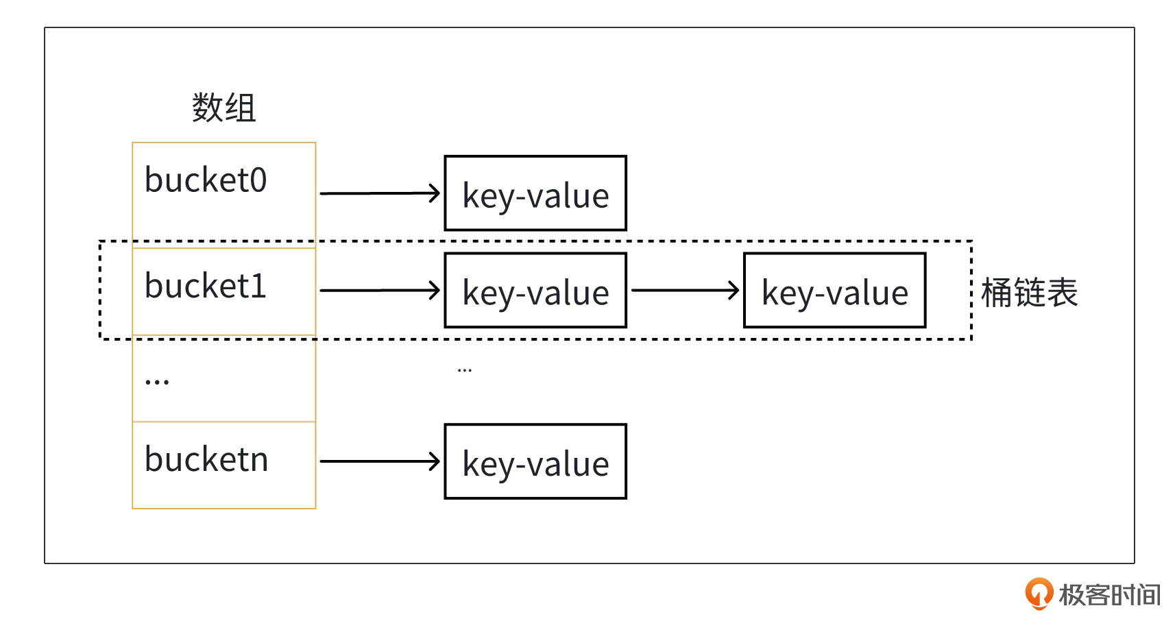 在搞明白map赋值操作的逻辑之前,我们需要先了解map的数据结构。就像下面的图展示的一样,map底层其实是以数组+链表的数据结构存储key-value对的。为了描述方便,数组的每一个位置,通常我们称它为桶。