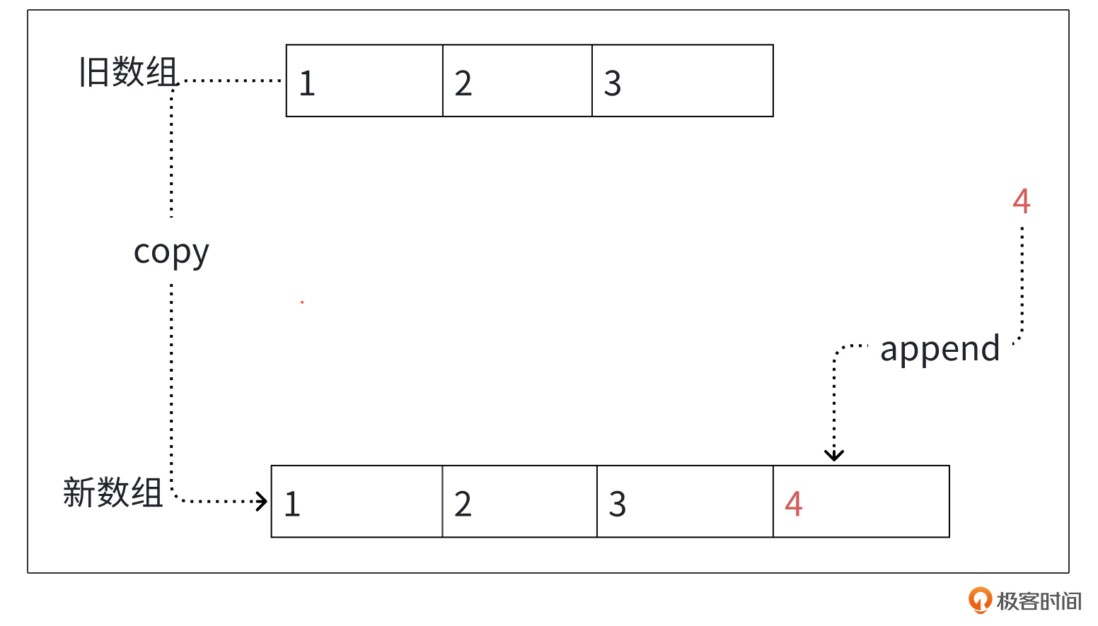 但是当数组空间不够时,append操作会触发扩容迁移,申请更大的数组空间,并将旧数组数据拷贝到新数组,以便存放更多的数据。