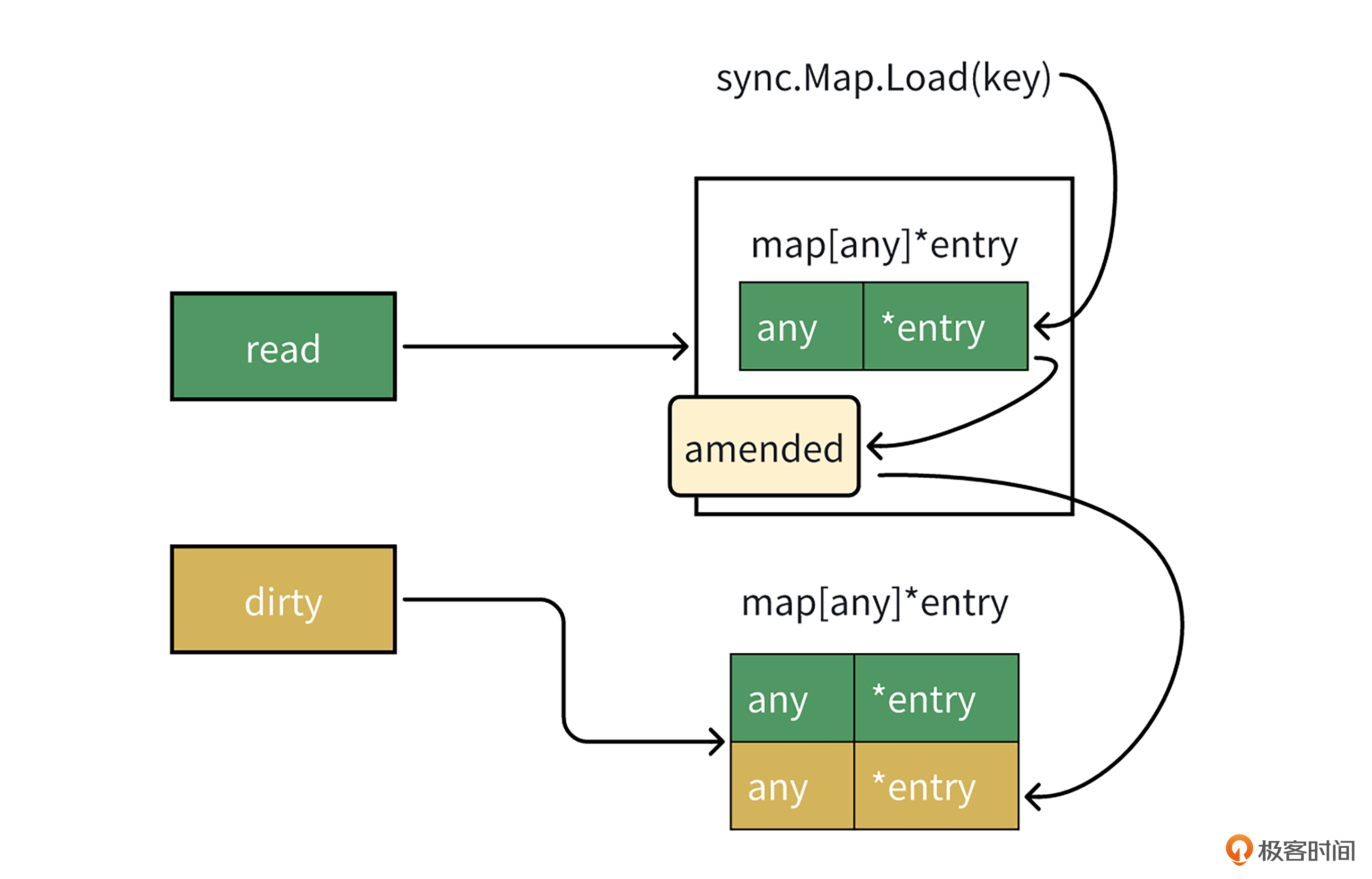 当读取key对应的值时,会先从read中读取,当read中读不到,并且amended为true时,则会加锁从dirty map中读。这里可能导致从sync.Map读取的性能劣化,因为它既要从read中读一遍,又要加锁从dirty map中读一遍。
