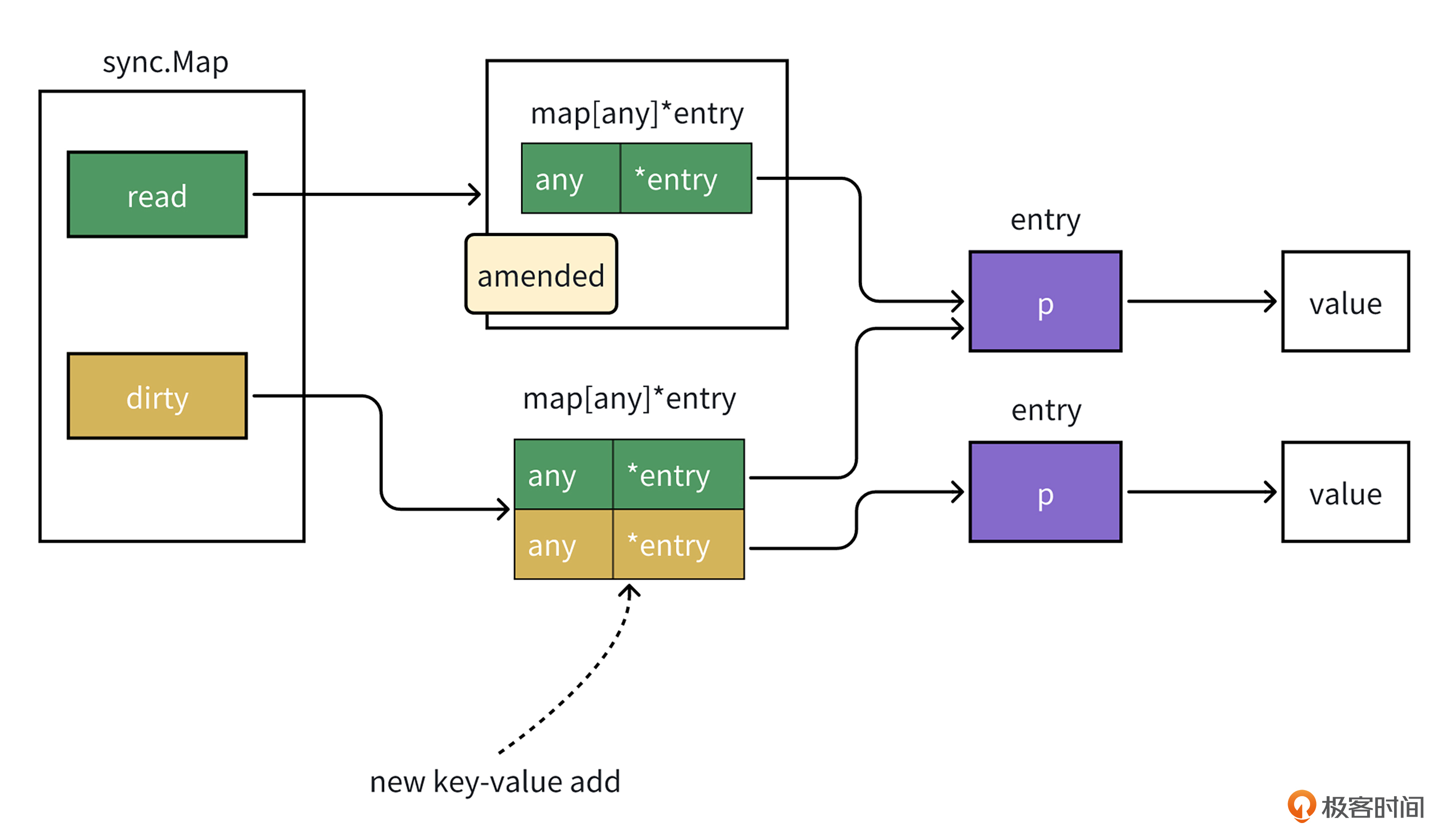 接着,让我们来看下写入操作。当有key-value值写入时,如果这个key在read中不存在,接下来就要做新增操作,它会加锁写入dirty map中,并且将amended标记设置为true。而amended标记用于表示dirty中是否有不在read中的key-value值。