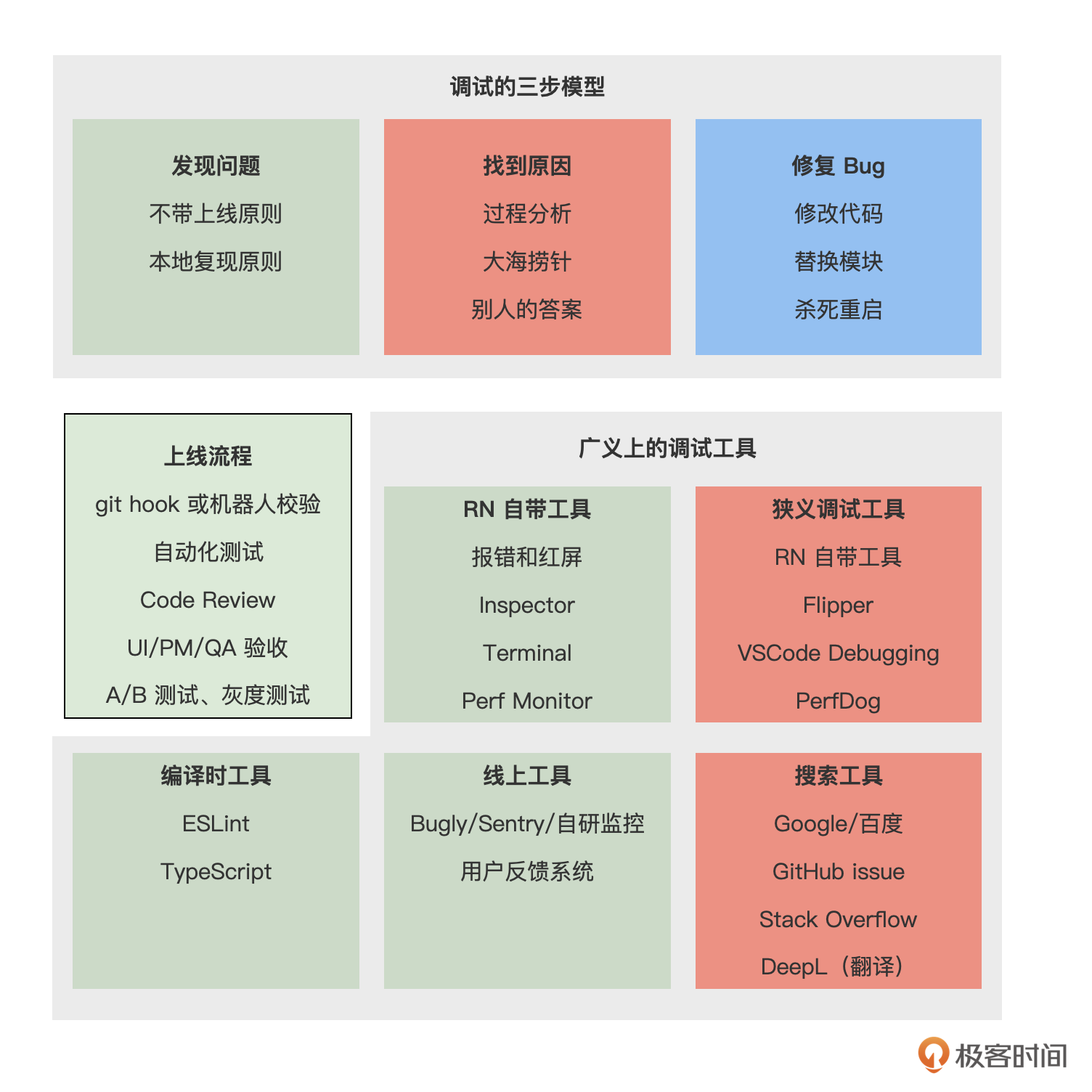 我给你画了一张调试的全貌示意图,把调试的三步模型、上线流程和广义上的调试工具都画上去了。你先停下来看一下,接下来我也会进行更详细的介绍。