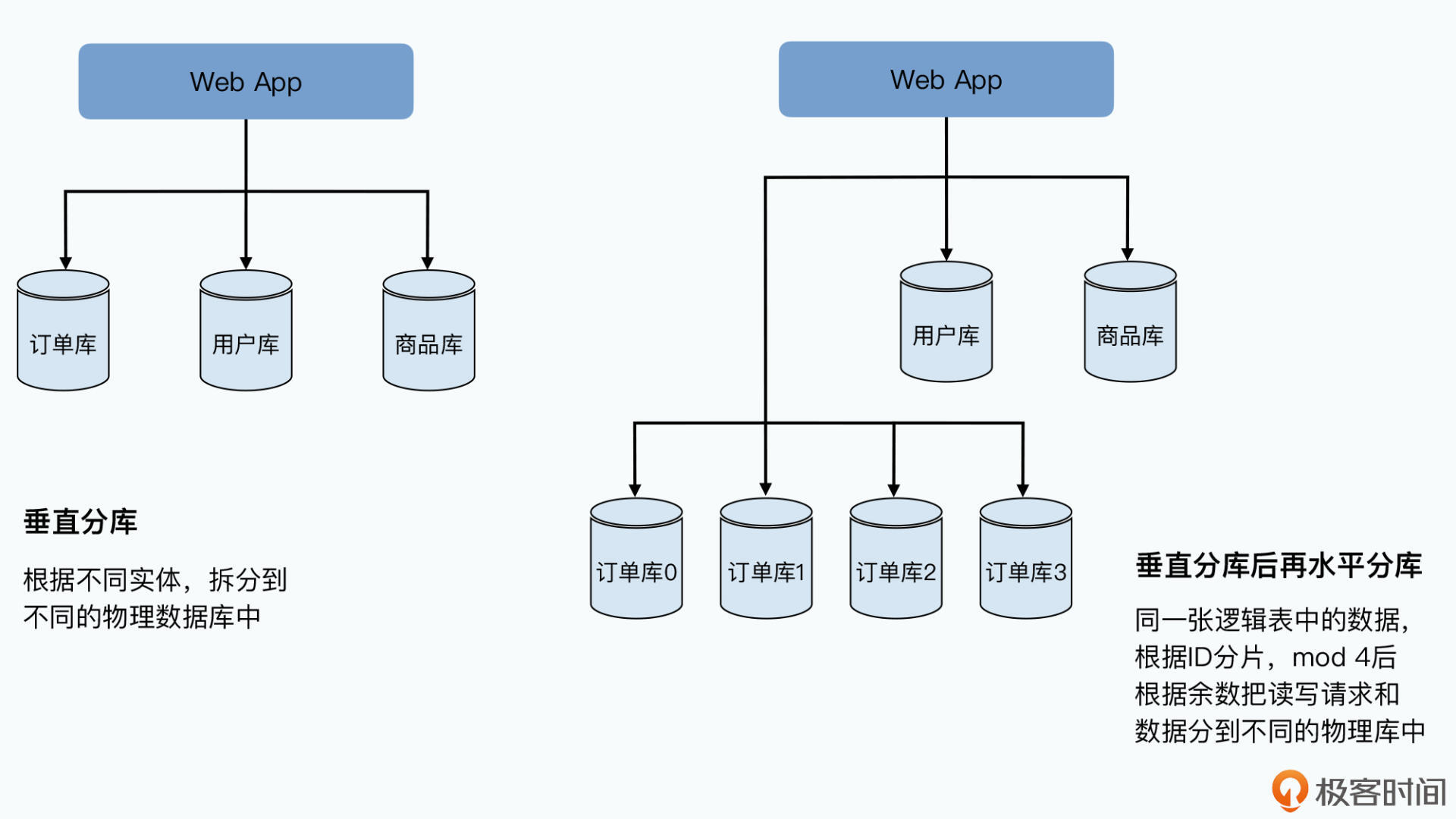 一般来说,我们会先做垂直分库,在电商的系统里,我们把用户、商品、订单的表拆分到不同服务器的数据库上。如果发现这样还不行,我们就再进行水平分库,把订单号Hash一下,然后取“模”(mod)个4,拆分到4台不同的服务器的数据库里。