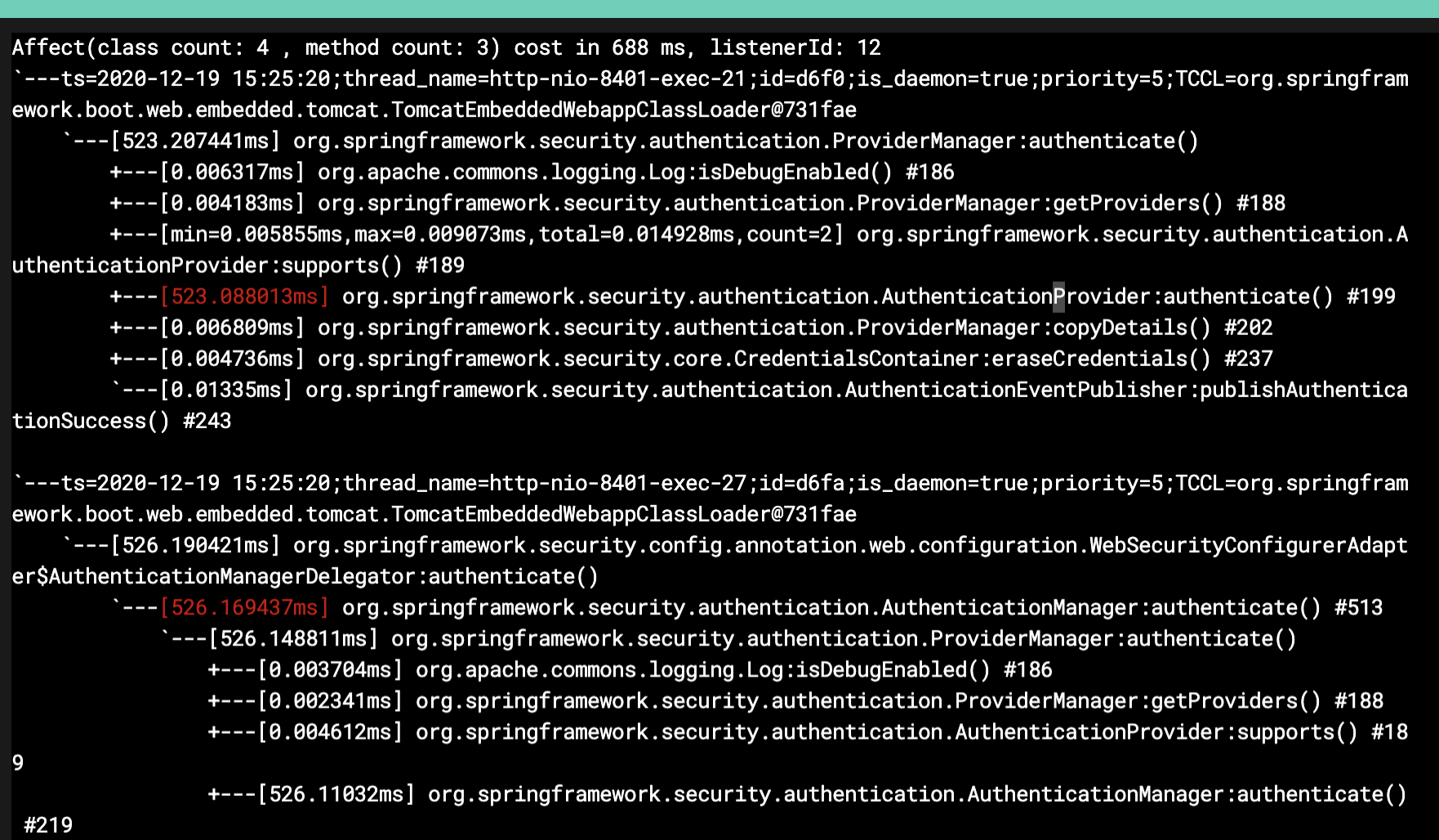 1 | trace com.dunshan.mall.auth.controller.AuthController postAccessToken '#cost > 1000' -n 3 |