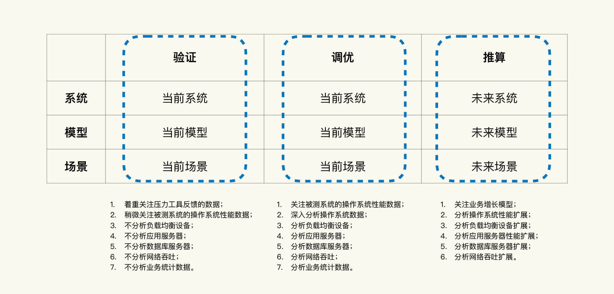 - 测试并评估未来几年内,性能容量是否可以满足业务发展。这个需求显然是要求测试未来的业务场景。