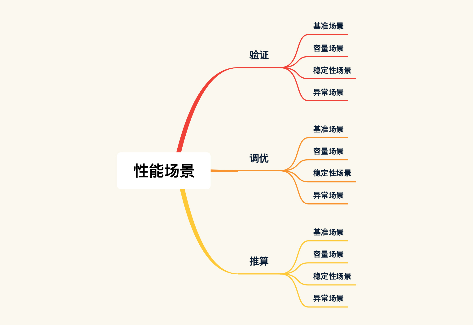 上述就是我们按照目标划分出的三类性能场景,这里我用一张图帮你总结一下,我希望你能对它们有了一个清楚的了解。