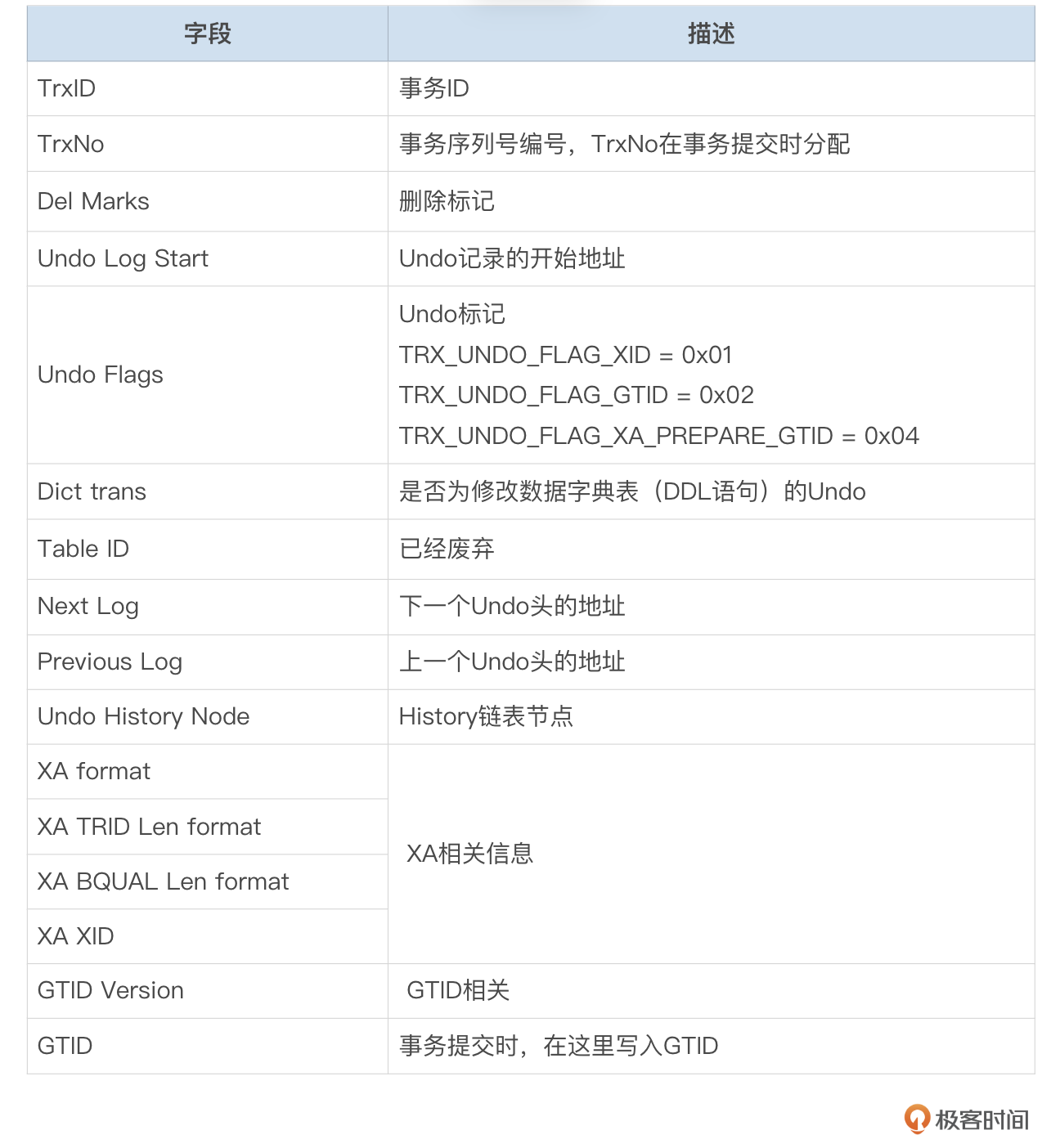Undo记录中字段的描述信息参考下面这个表格。