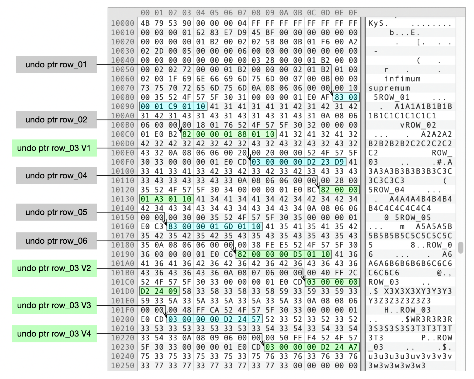 我把测试案例中几行数据的db_roll_ptr整理到了下面这个表格中。