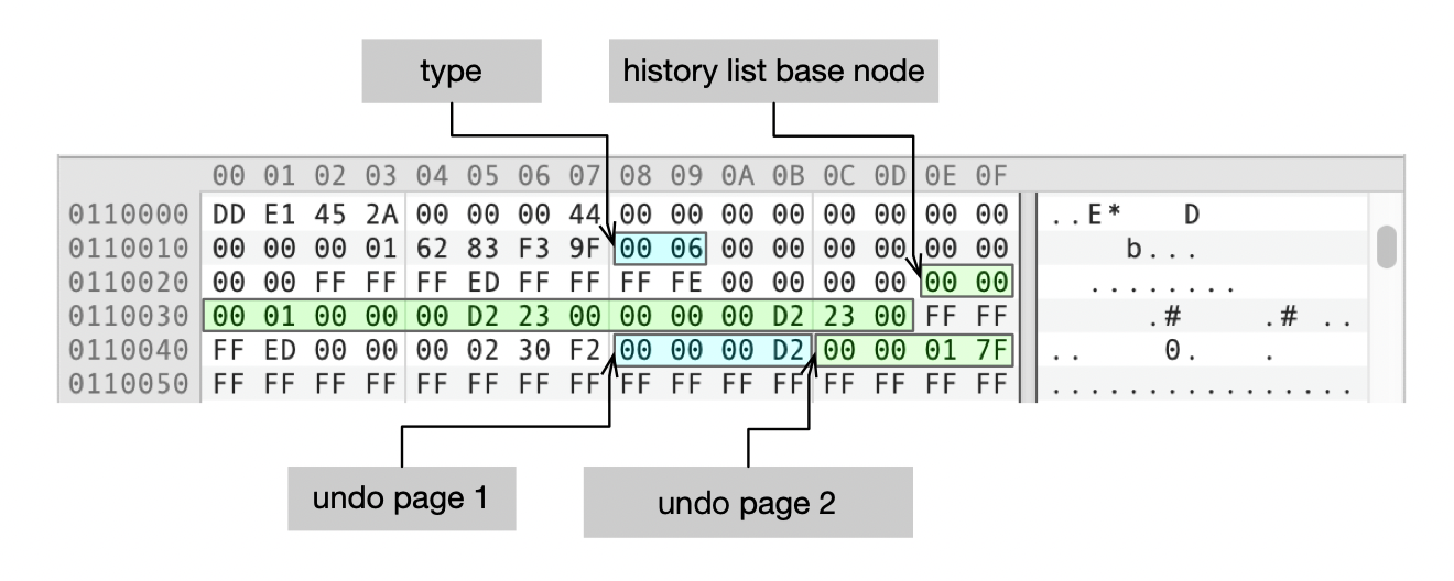- Latest Log(22DE)指向页面内最新的Undo日志头,地址为0x348000 + 0x22DE = 0x34A2DE。