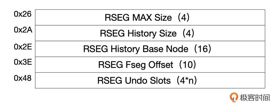 回滚段的格式也比较简单。RSEG History Base Node是历史Undo日志链表的基节点,Purge线程就是从这个节点开始搜索要清理的Undo日志。RSEG Undo Slots中记录了Undo段头所在的页面编号,最多存1024个Undo段。