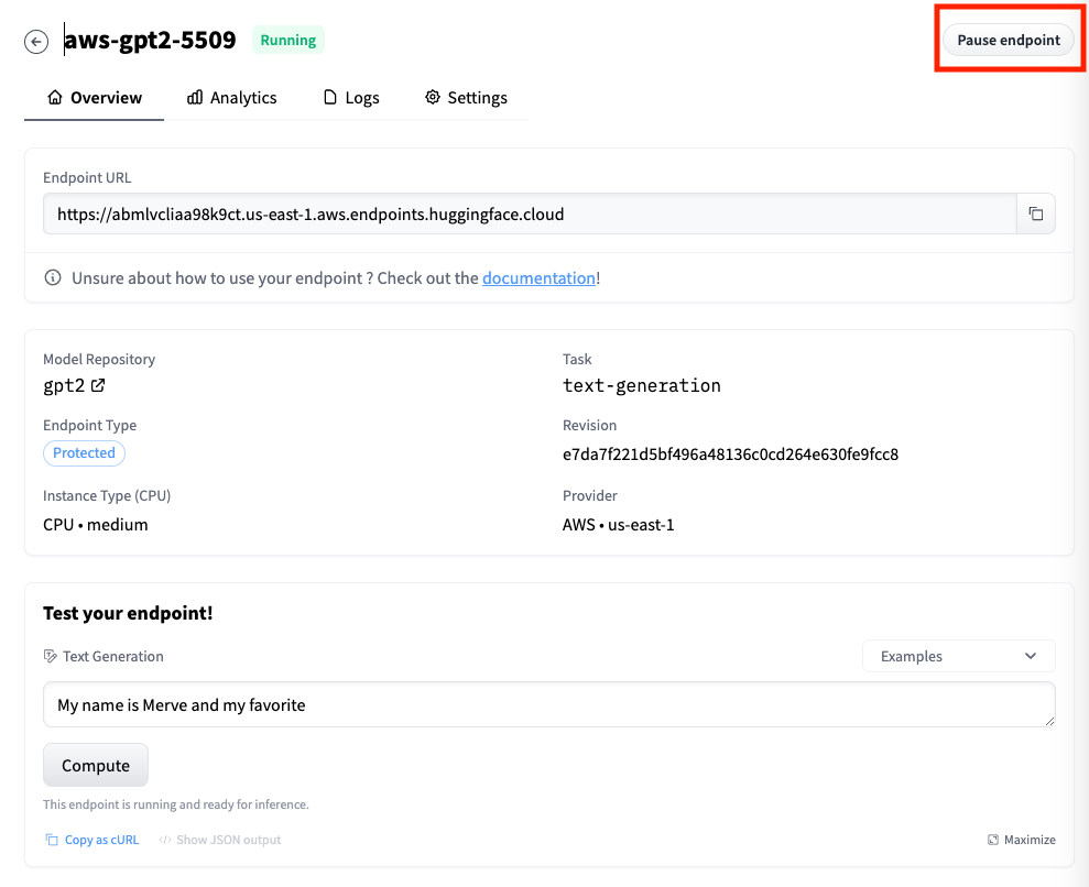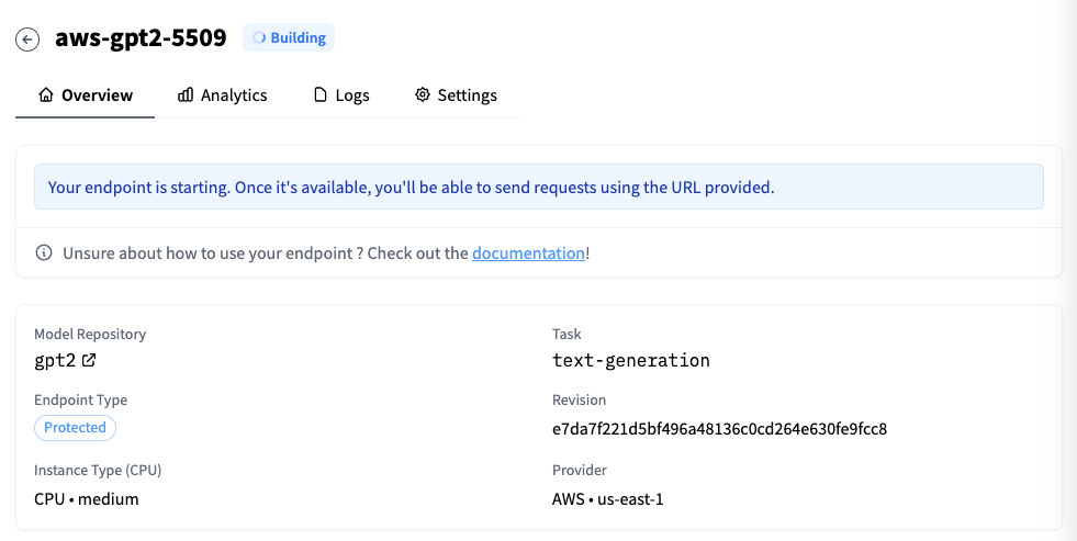 我们只要等待几分钟,模型就能部署起来。当然,这是因为GPT2的模型比较小。如果你尝试部署一些大尺寸的模型,可能需要1-2个小时才能完成。因为HuggingFace要完成模型下载、Docker镜像打包等一系列的工作,单个模型又很大,所以需要更长时间。