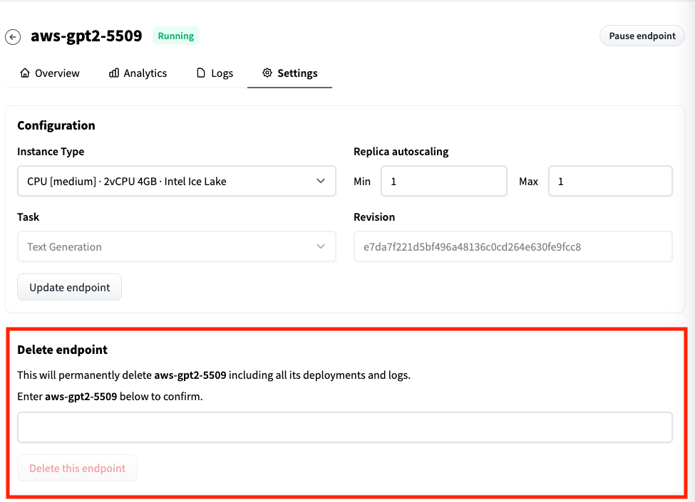 如果你彻底不需要使用这个模型了,你可以把对应的Endpoint删掉,你只需要在对应Endpoint的Setting页面里输入Endpoint的名称,然后选择删除就好了。