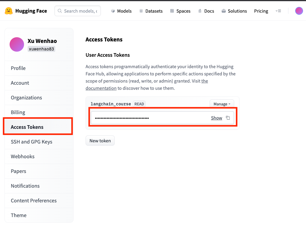 首先,和其他的API Key一样,我们还是通过环境变量来设置一下Huggingface的Access Token。你可以在Huggingface的个人设置里面拿到这个Key,然后通过export设置到环境变量里就好了。