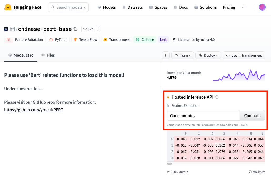 比如上面截图里的 hfl/chinese-pert-base 模型支持的就是 feature-extraction 的任务,它能够让你把自己的文本变成向量。我们不妨来试一试。