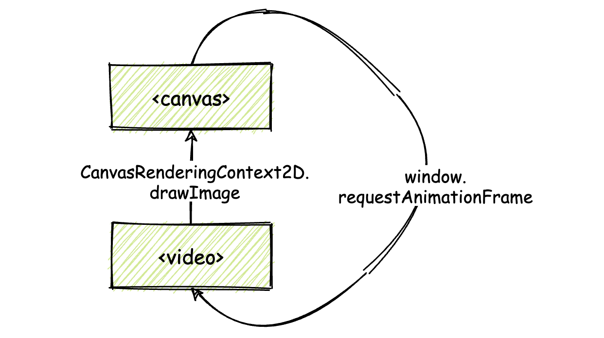 为了能够让绘制到 <canvas> 上的画面可以随着视频的播放来实时更新,这里我们将使用名为 “window.requestAnimationFrame” 的 Web API, 来实时更新绘制在 <canvas> 上的画面内容(如果你对这个 API 不太熟悉,可以点击[这里]回到“基础课”进行复习)。