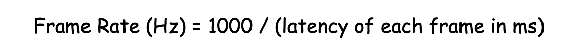 帧率的一个粗糙计算公式如下图所示。对于帧率,我们可以将其简单理解为在 1s 时间内屏幕上画面能够刷新的次数。比如若 1s 时间内画面能够更新 60 次,那我们就可以说它的帧率为 60 赫兹(Hz)。