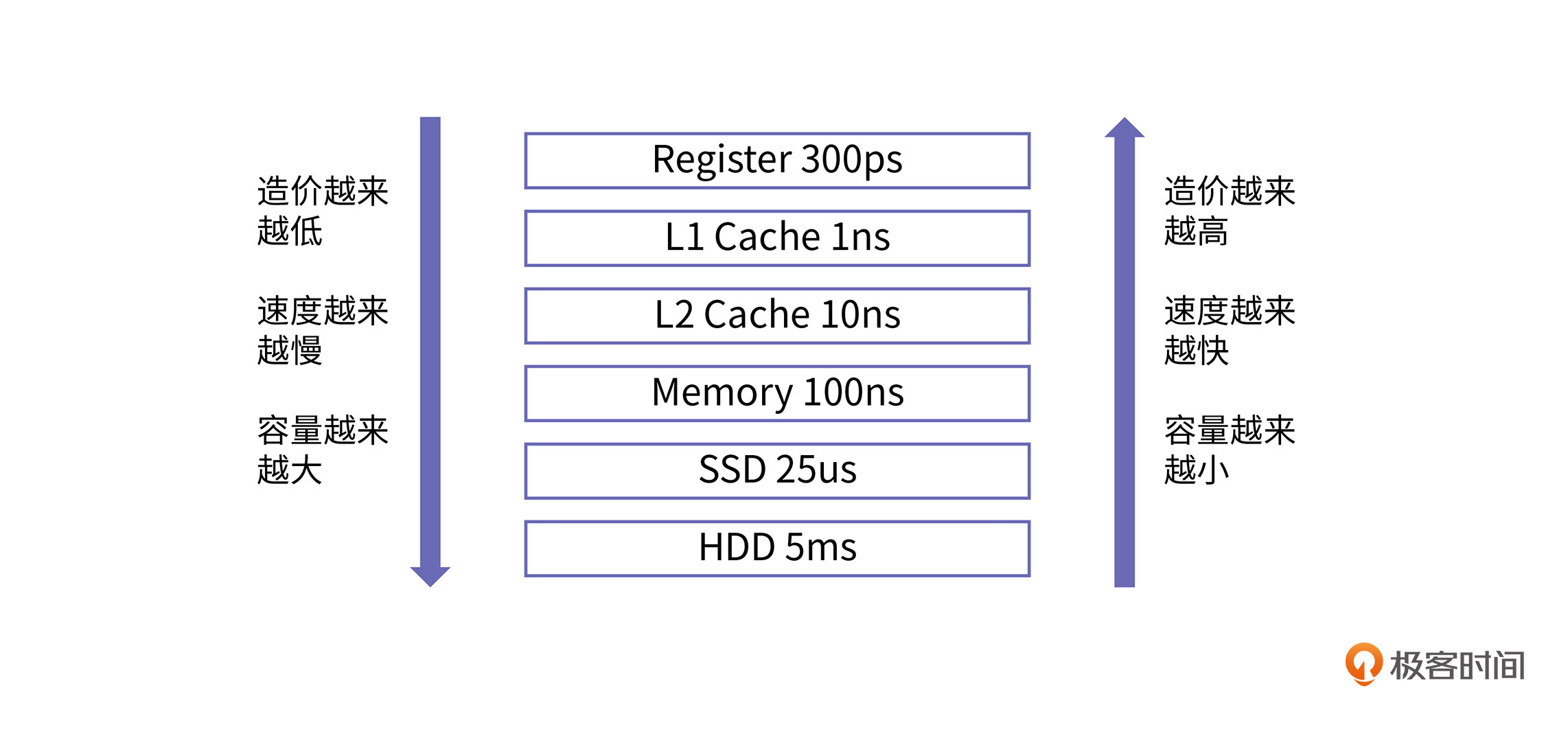 经过上一节课的学习,我们了解到不同的物理器件,它们的访问速度是不一样的:速度快的往往代价高、容量小;代价低且容量大的,速度通常比较慢。为了充分发挥各种器件的优点,计算机存储数据的物理器件不会只选择一种,而是以CPU为核心,由内而外地组建了一整套的存储体系结构。它将各种不同的器件组合成一个体系,让各种器件扬长避短,从而形成一种快速、大容量、低成本的内存系统。