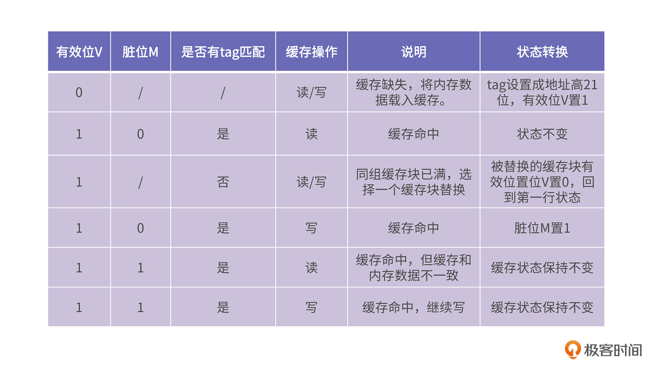 其中,V(valid)表示这个缓存块是否有效,或者说是否正在被使用;M(modified)表示这个缓存块是否被写,也就是“脏”位;B表示缓存块的bit个数。