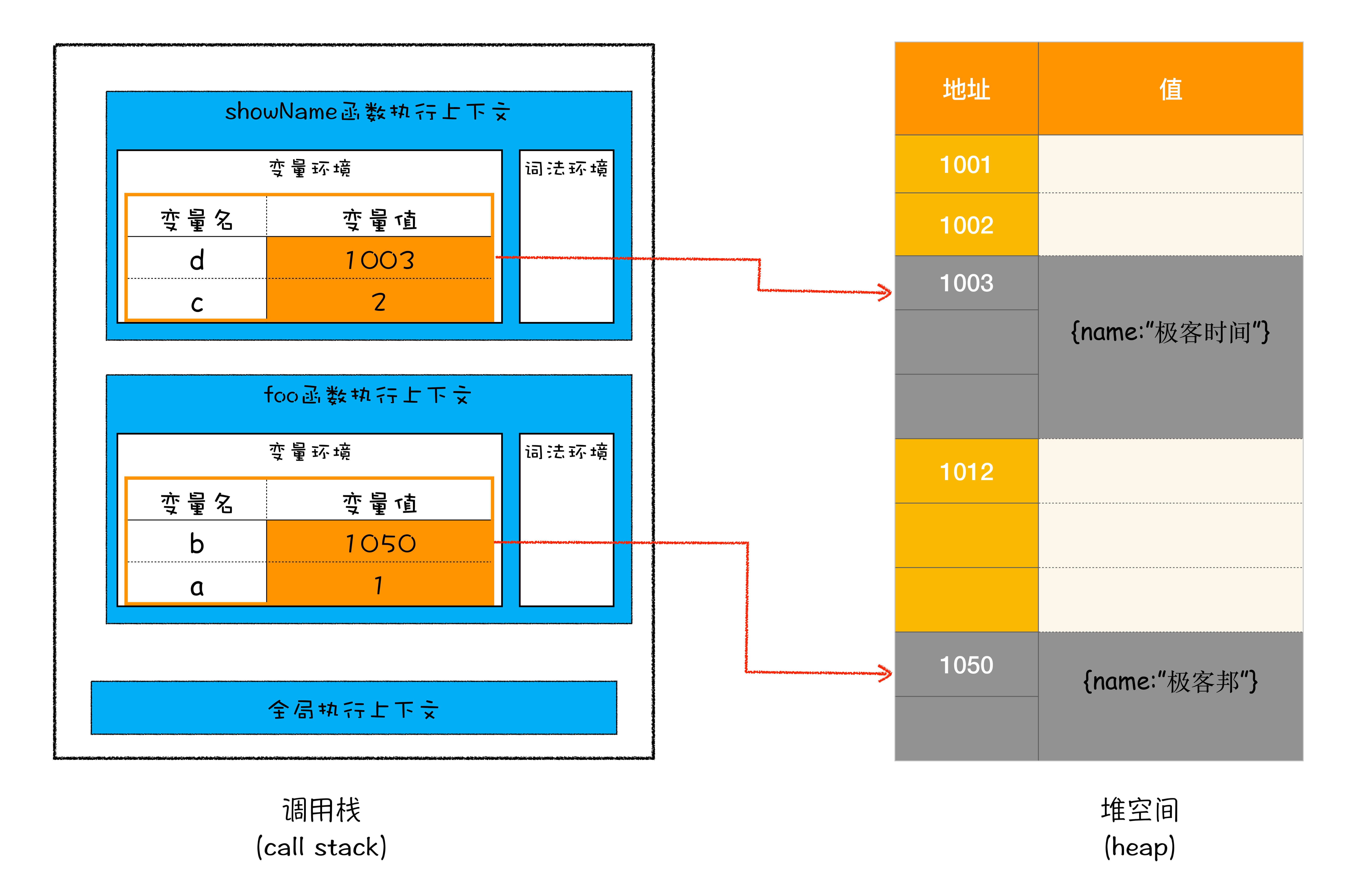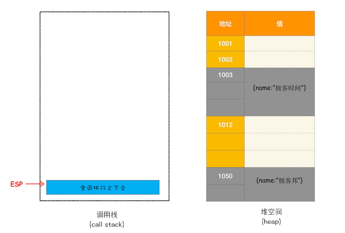 通过上面的讲解,我想现在你应该已经知道,当上面那段代码的foo函数执行结束之后,ESP应该是指向全局执行上下文的,那这样的话,showName函数和foo函数的执行上下文就处于无效状态了,不过保存在堆中的两个对象依然占用着空间,如下图所示: