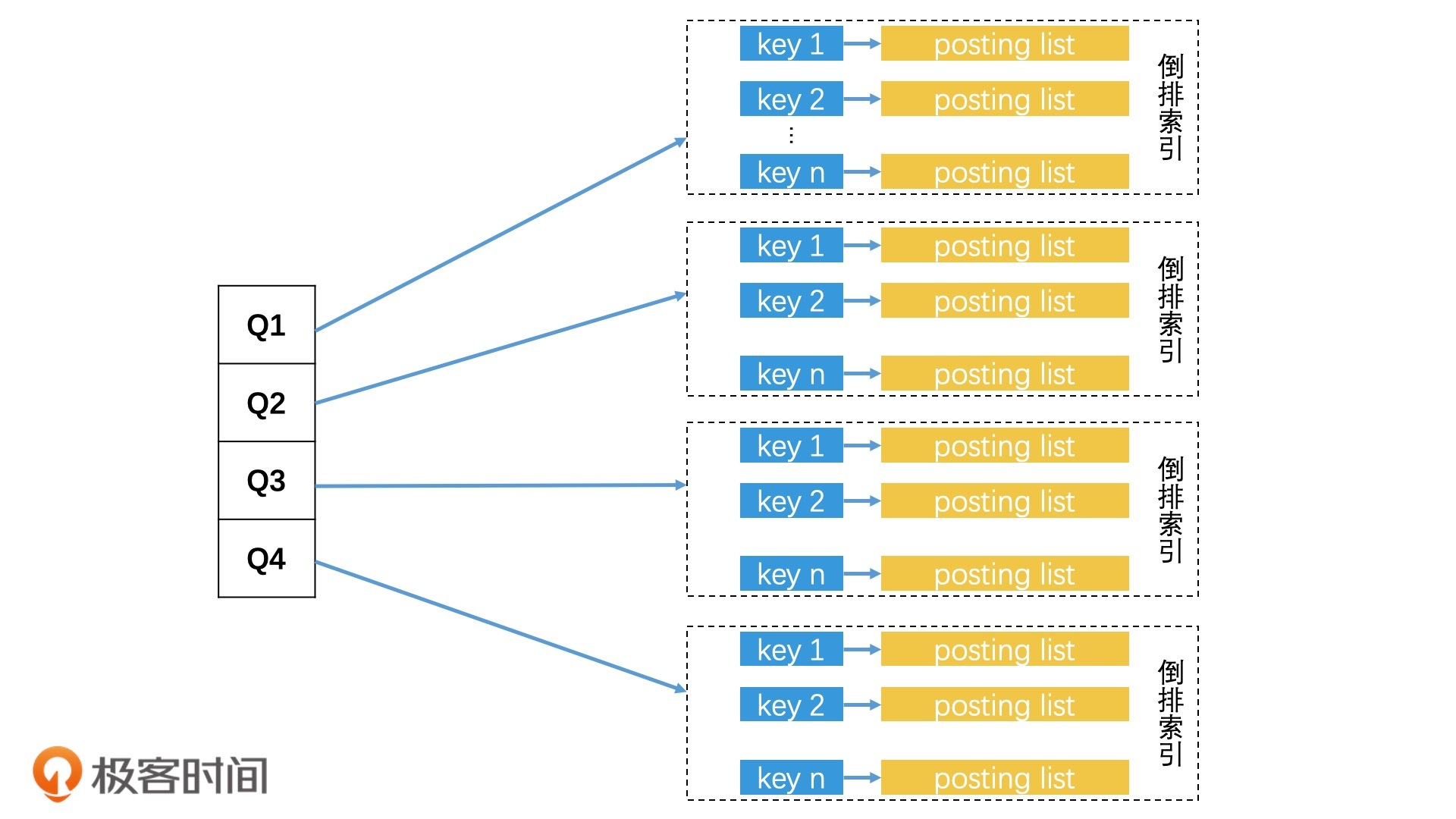 根据这个思路,我们可以将每一个文档都根据比特位划分为4段,以每一段的16个比特位的值作为Key,建立4个倒排索引。检索的时候,我们会把要查询文档的SimHash值也分为4段,然后分别去对应的倒排索引中,查询和自己这一段比特位完全相同的文档。最后,将返回的四个posting list合并,并一一判断它们的的海明距离是否在3之内。