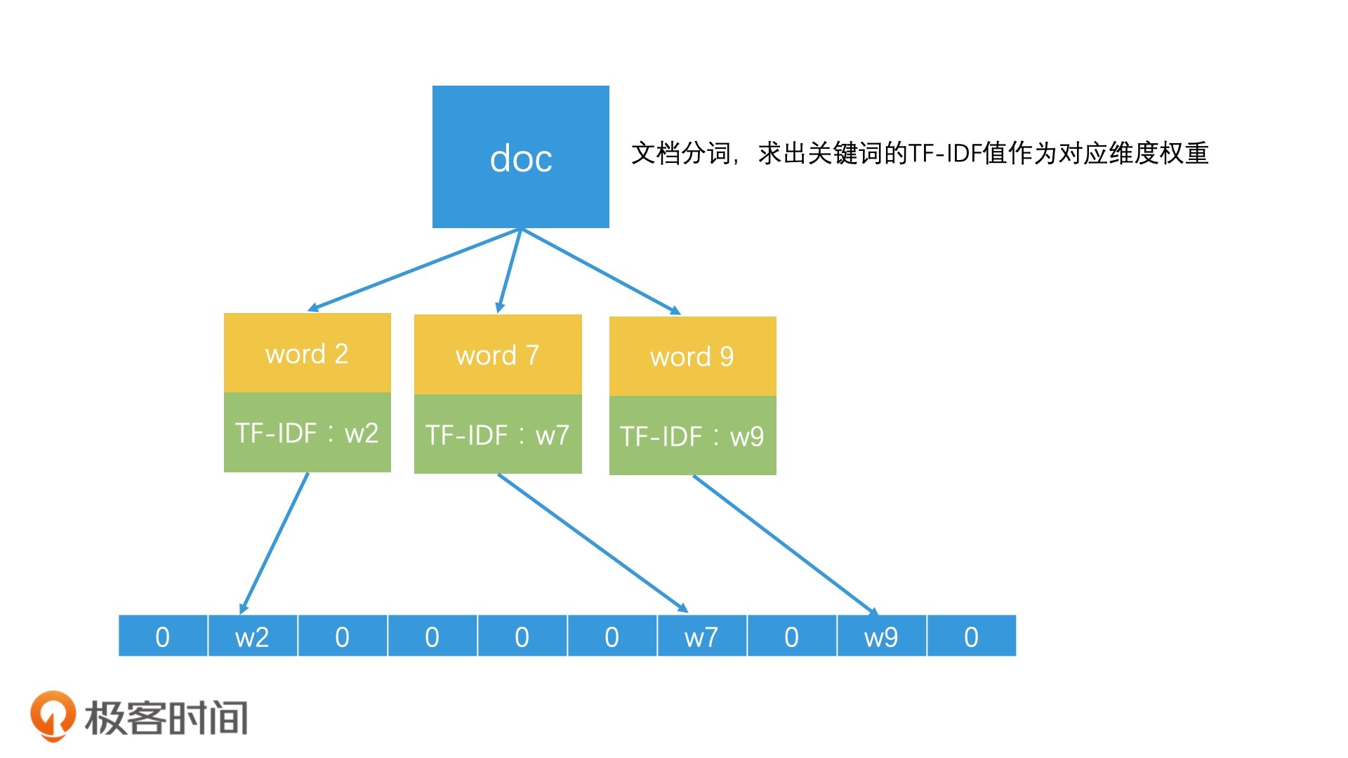 那一篇文档具体该如何表示呢?我们可以假设,一篇文章中有k(0<k<=n)个关键词,如果第k个关键词在这个文档中的权重是w,那这个文档在第k维上的值就是w。一般来说,我们会以一个关键词在这篇文档中的TF-IDF值作为w的值。而如果文章不包含第k个关键词,那它在第k维上的值就是0,那我们也可以认为这个维度的权重就是0。这样,我们就可以用一个n维的向量来表示一个文档了,也就是<w1,w2,w3,……wn>。这样一来,每一个文档就都是n维向量空间中的一个点。
