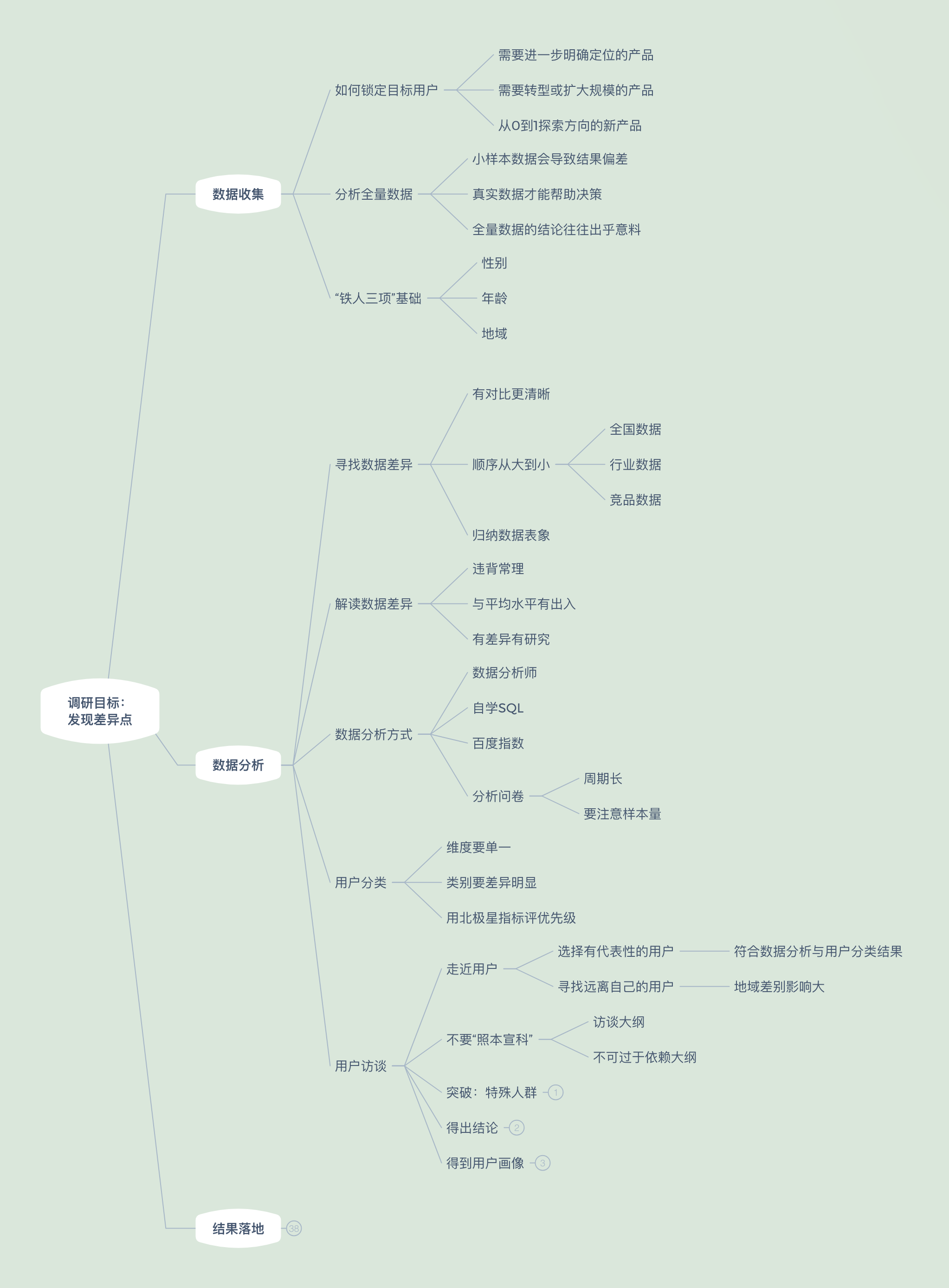 根据今天的专栏内容,用户调研知识地图中补充了“分析”这部分的新支点。重点在于如何做好用户访谈。