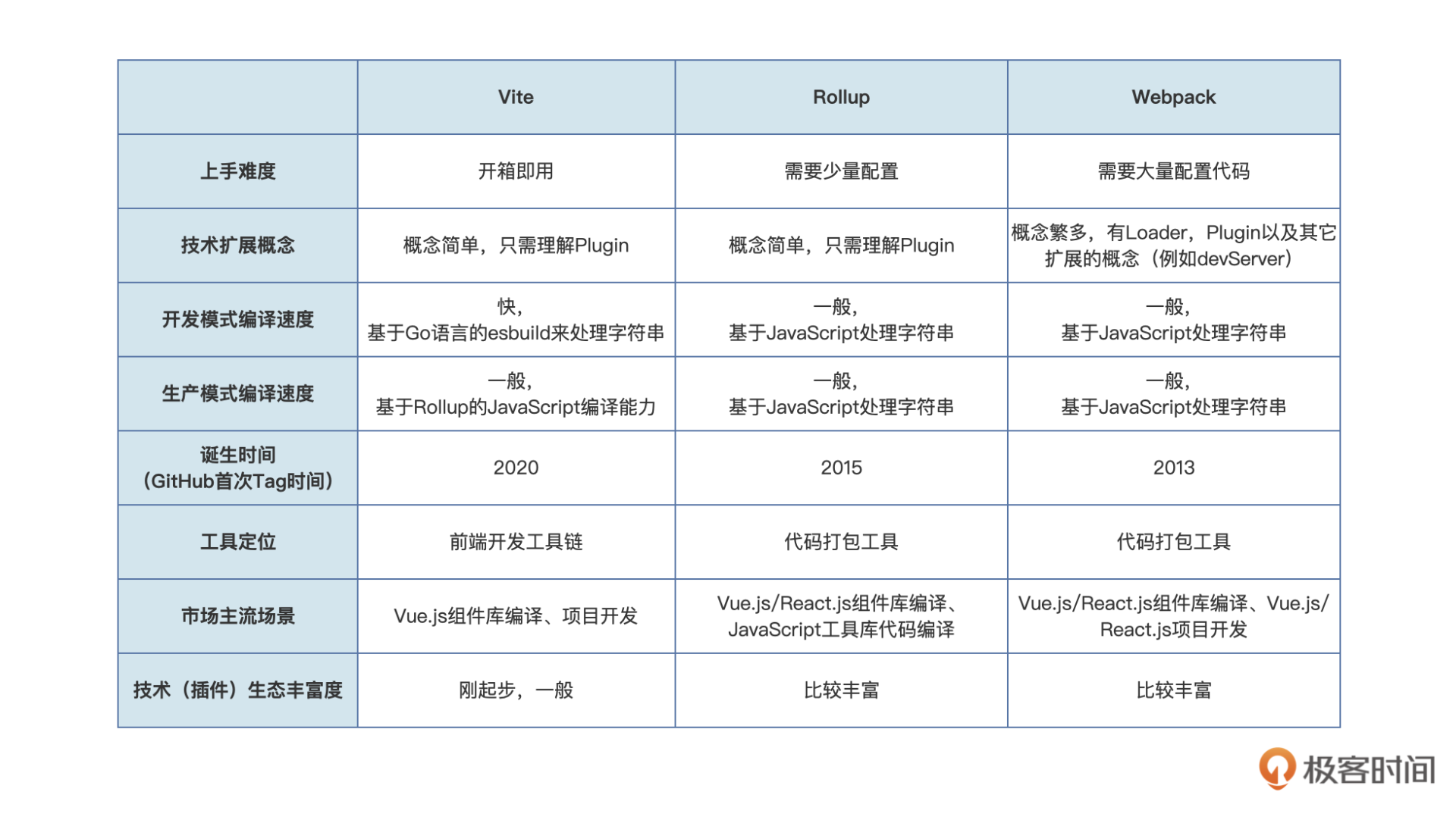 这里我将Vite和Rollup,再结合之前讲解的Webpack一起做个对比,如下图所示:
