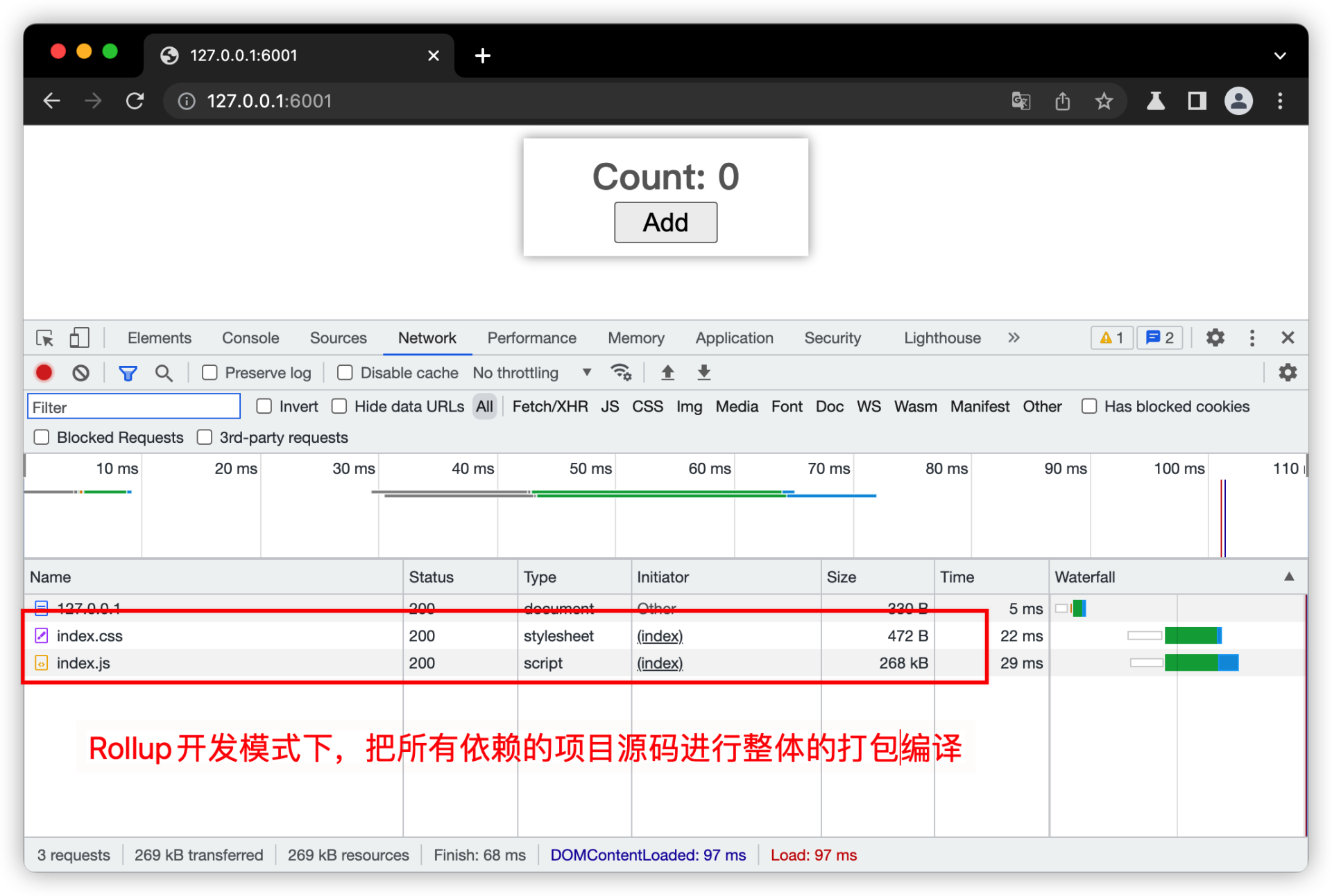 我们直接来看看那Rollup在开发模式下,打包编译后在浏览器里的执行效果图片: