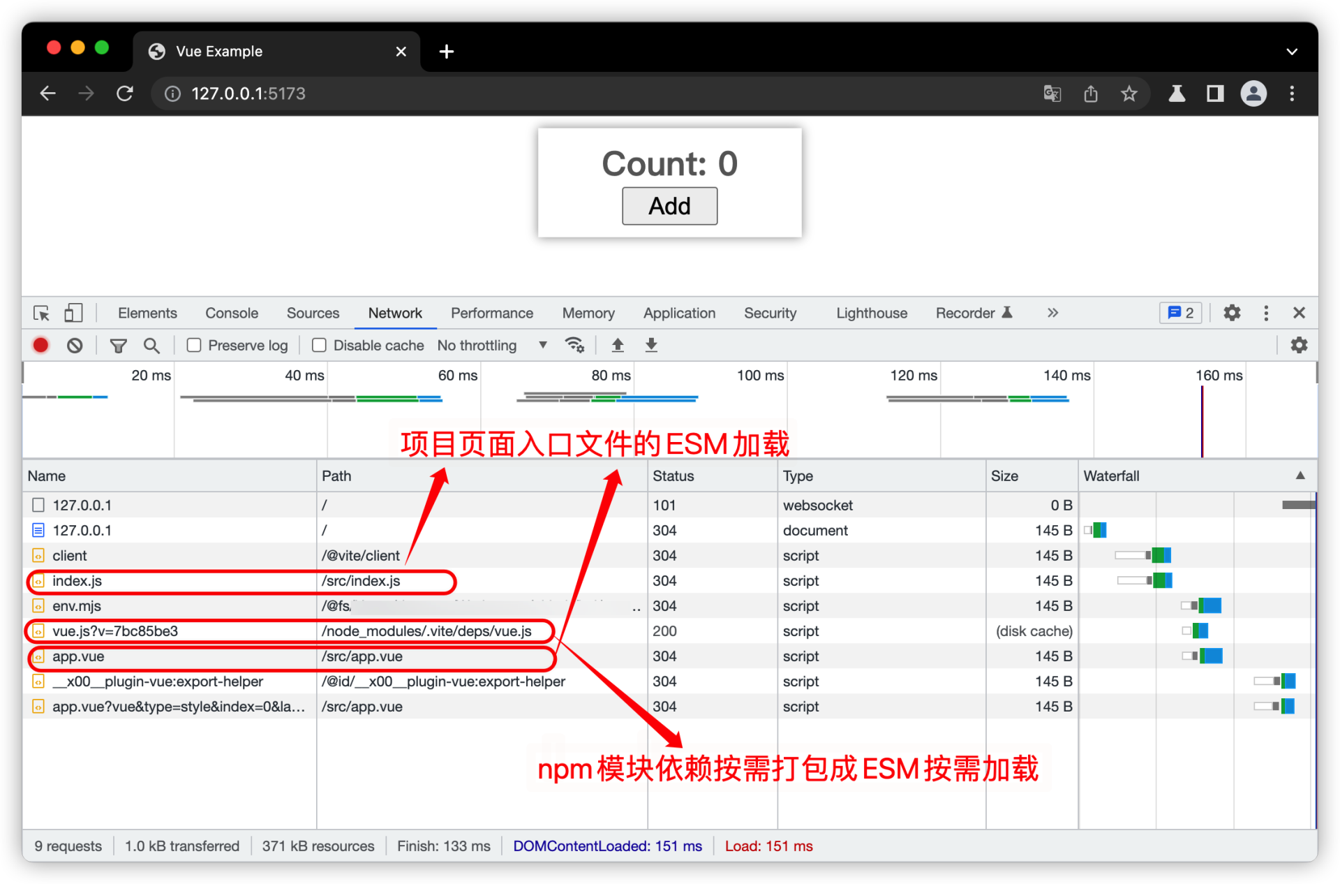 你可以看到,所有加载的JavaScript文件都是ESM模块文件。这些项目源码文件和npm依赖模块都是经过esbuild快速单独编译封装的ESM模块文件,不需要像Rollup那样经过重新分析语法和文件打包编译一个Bundle文件,省去了很多编译时间,这就是Vite为什么在开发模式下能快速编译的原因。