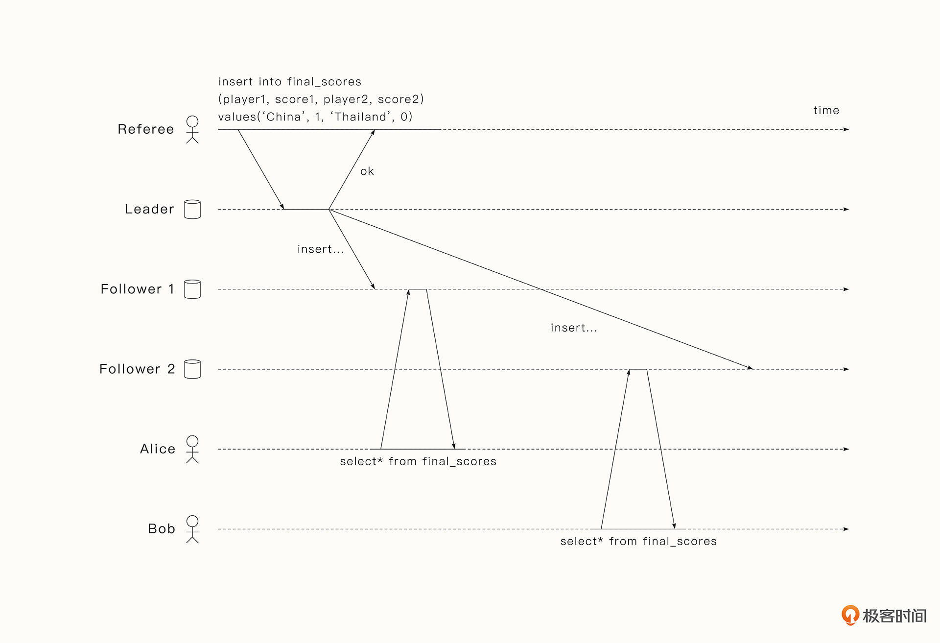 - 第二种情况:Alice与Bob访问数据时,数据已经同步到Follower A和Follower B,因此Alice和Bob可以同时看到最新的比分数据。