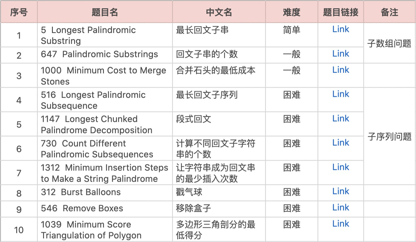 除了线性问题以外,还有一种特别容易在技术面试环节考察的题目类型:区间类型问题。事实上,我们在专栏的课程中已经对这类问题做了深入探讨,比如“最长回文子序列”问题就属于这类区间类型的问题。