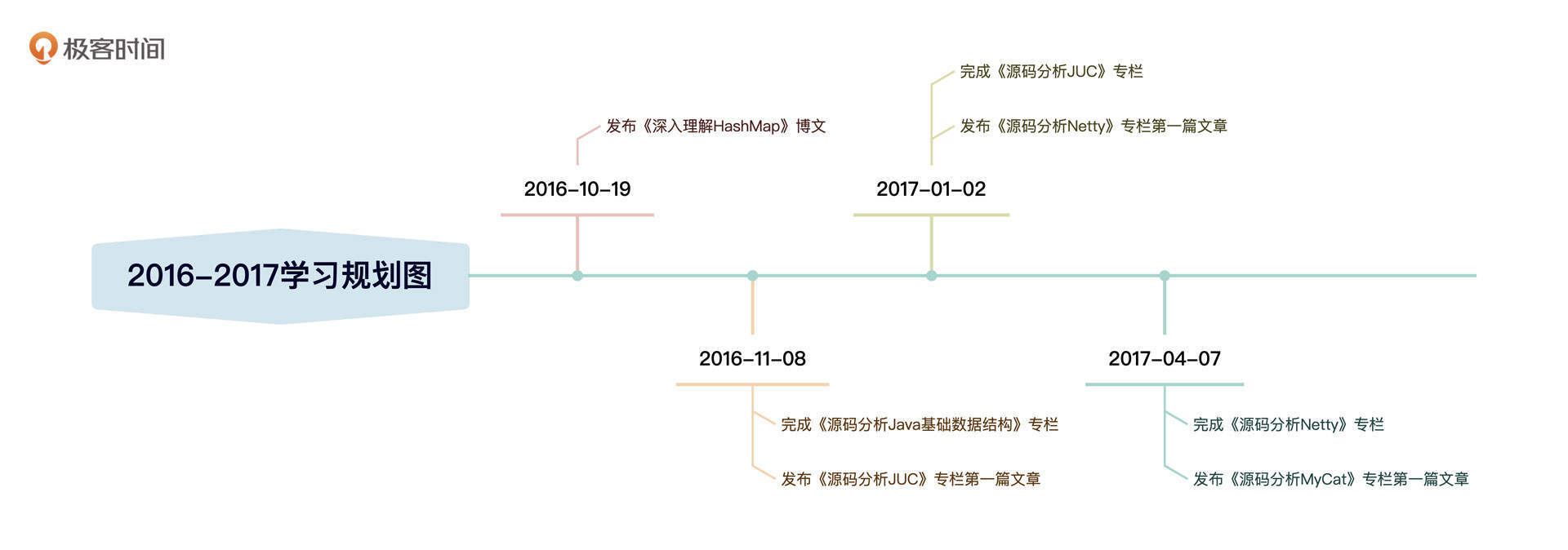 2016年10月,我开始学习Java数据结构,学习的过程中,我会把知识点和自己的思考记录下来。到2017年4月,我完成了分析Netty源码的专栏。整个基础学习阶段大概持续了半年。这之后,我再次尝试阅读MyCat源码已经没有任何阻力了,于是接下来我又发表了《源码分析MyCat》系列文章。