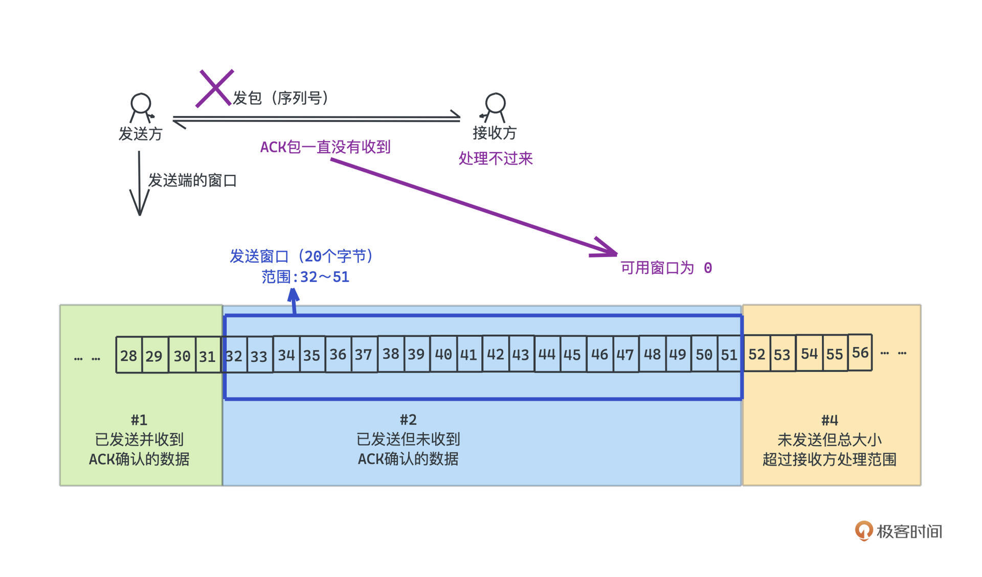 但如果发送方一直没有收到ACK,随着数据不断被发送,很快可用窗口就会被耗尽。在这种情况下,发送方也就不会继续发送数据了,这种发送端可用窗口为零的情况我们也称为“零窗口”。