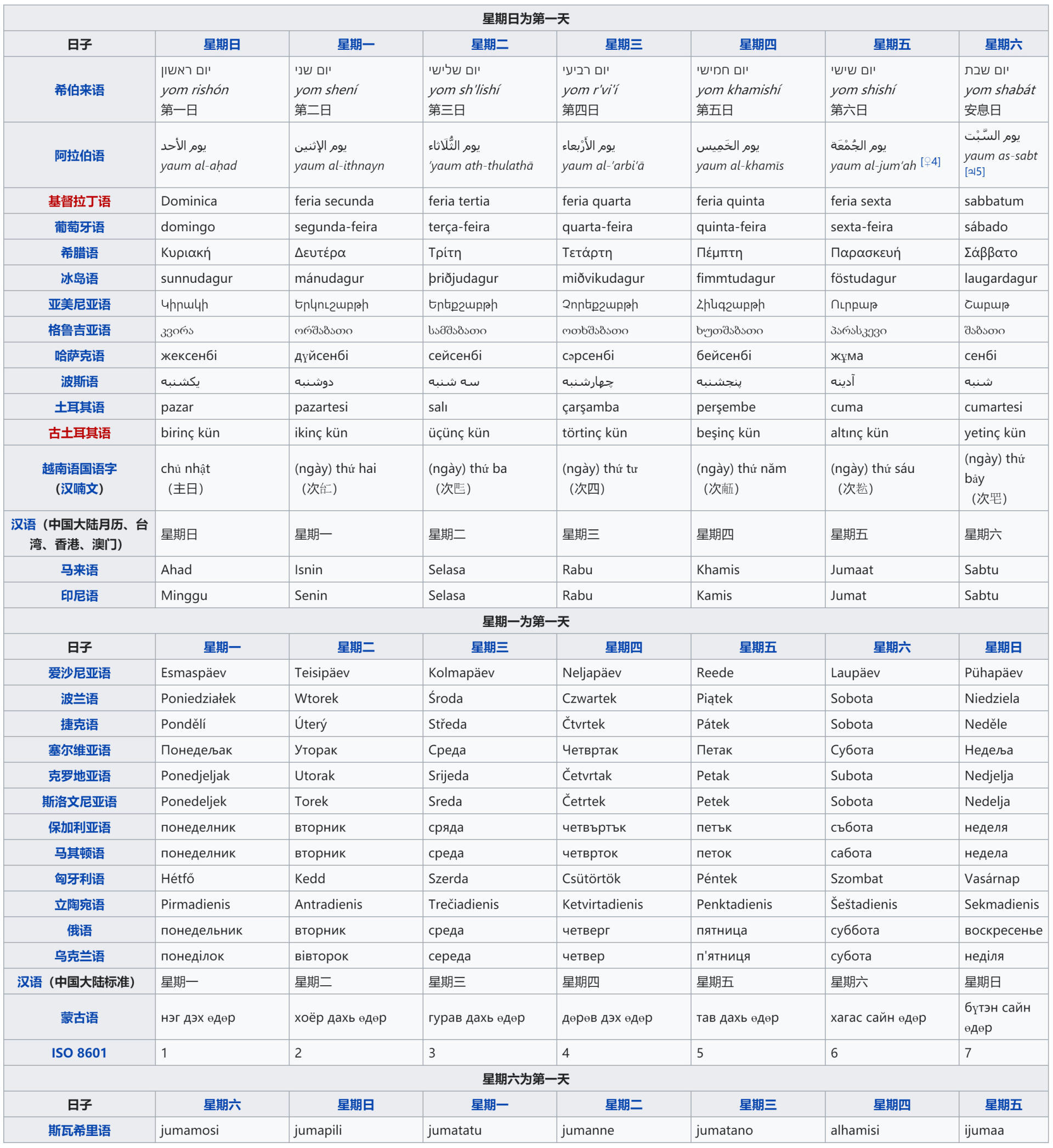 尽管都是一周七天,犹太人认为周日是一个星期的第一天。而在一些穆斯林国家,工作日是从星期六开始的。你可以参考一下下面这个表格。