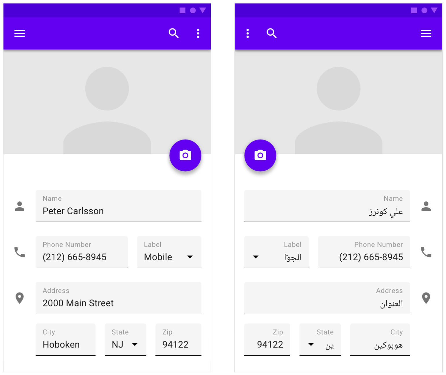 下图是根据我们刚刚讲的规则进行的通讯录界面排版变化示例。在主要元素的排版上几乎都是镜像排版。因为都是遵守右手习惯,搜索和电话的图标并未镜像处理。电话号码的书写方式也并未发生变化,仅仅是输入框从左边移到了右边。