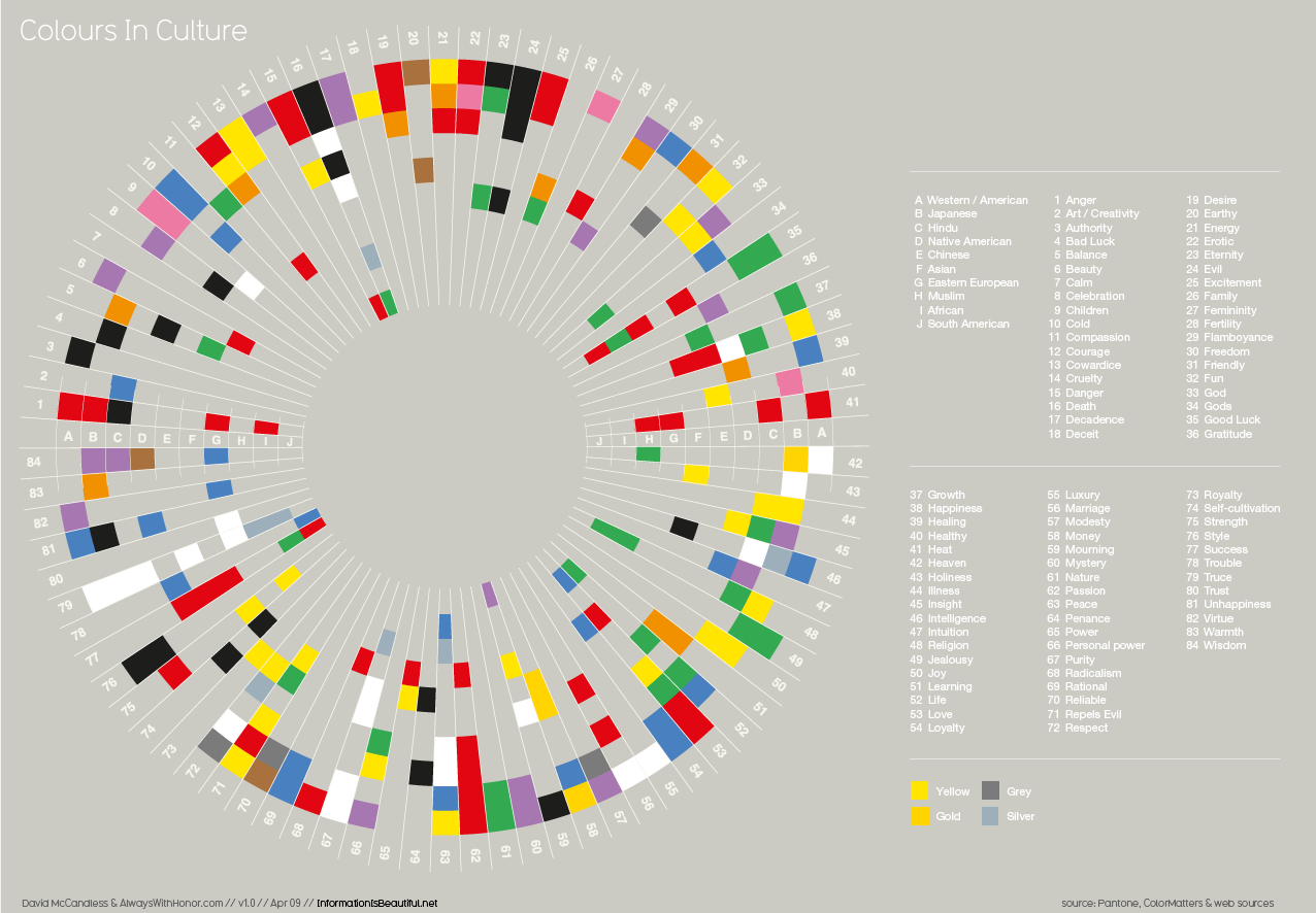 首先是色彩的禁忌。我在[04]里提过这个话题。你可以对照下图再简单回顾下不同文化背景在各种场景下对色彩的偏好。比如红色在欧美代表停止和错误,所以股票跌用红色表示。但红色在中国代表热烈、吉祥和喜乐,所以股票涨会用红色表示。