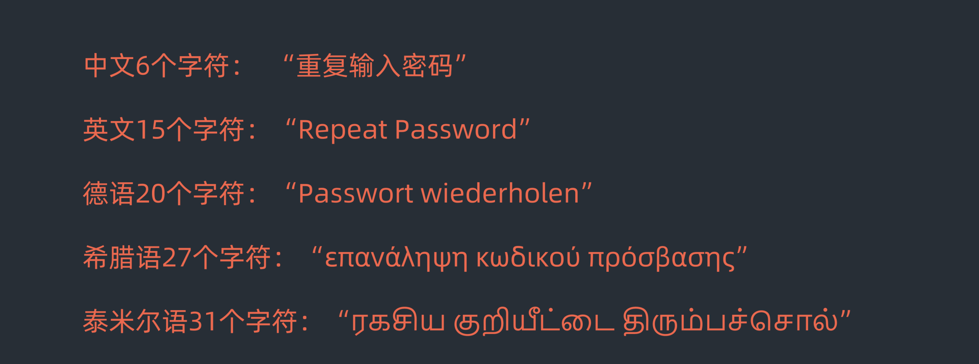 首先你需要注意的就是你的控件是否留出了足够的翻译长度。比如中文的“重新输入密码”占6个字符长度。对应到英语上“Repeat Password”是15个字符长度,希腊语是27个字符(επανάληψη κωδικού πρόσβασης),而印度南部的泰米尔语是夸张的31个字符(ரகசிய குறியீட்டை திரும்பச்சொல்)。参见下图: