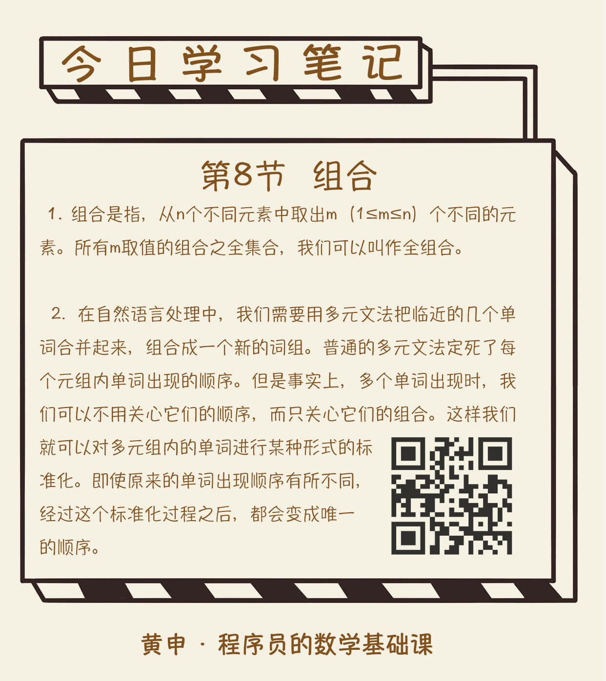 组合和排列有相似之处,都是从n个元素中取出若干个元素。不过,排列考虑了取出的元素它们之间的顺序,而组合无需考虑这种顺序。这是排列和组合最大的区别。因此,组合适合找到多个元素之间的联系而并不在意它们之间的先后顺序,例如多元文法中的多元组,这有利于避免不必要的数据保存或操作。