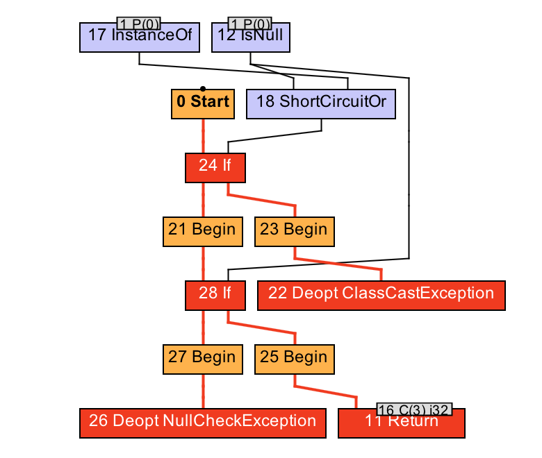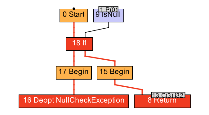 让我们回到原本的例子中。从test方法的IR图可以看出,生成的代码无须检测调用者的动态类型是否为Add,便直接执行内联之后的Add.apply方法中的内容(2+1经过常量折叠之后得到3,对应13号常数节点)。这是因为动态类型检测已被移至假设之中了。